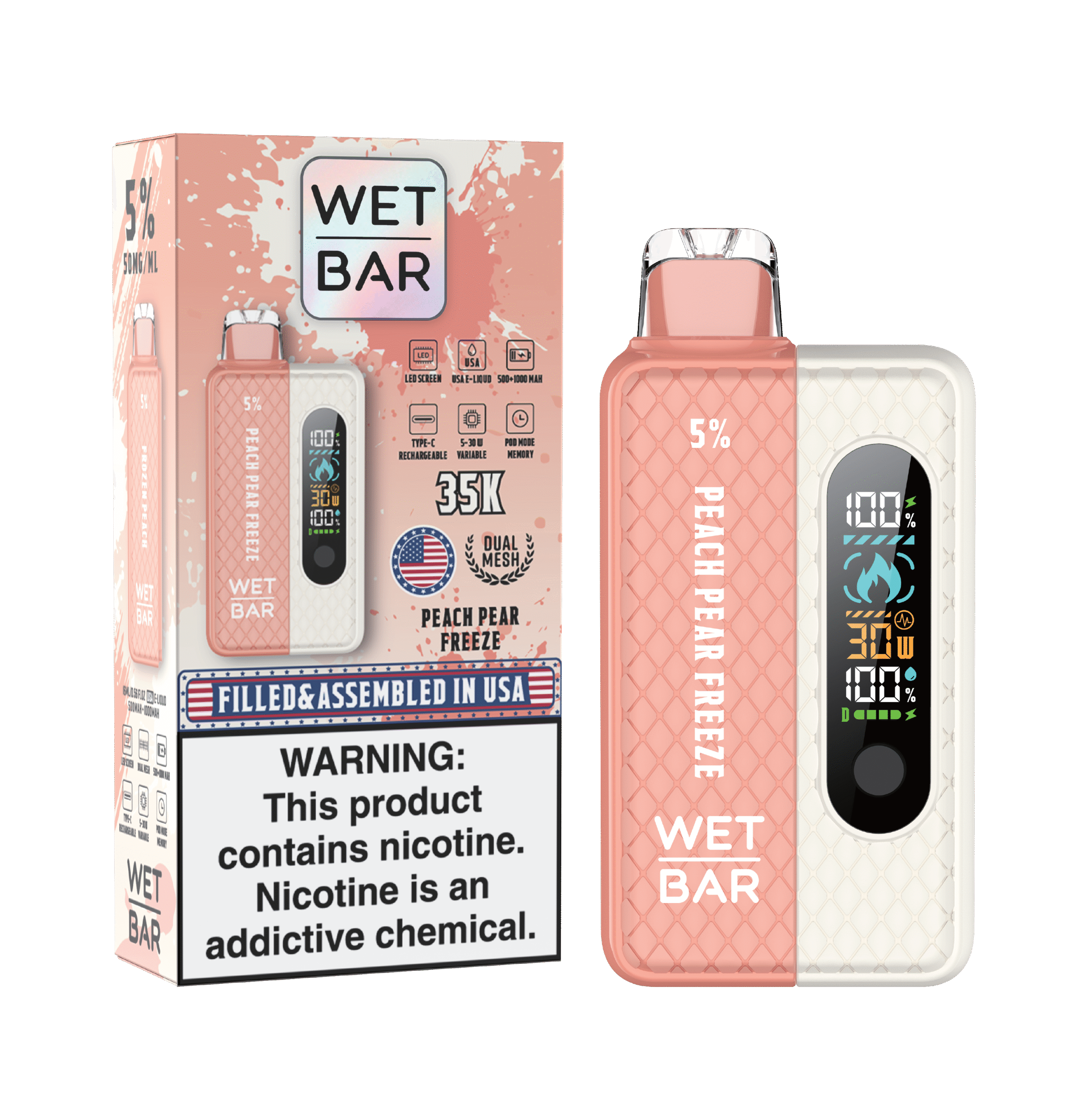 Experience the Wet Bar 35K Puff Kit in Peach Pear. Rechargeable device designed for smooth, consistent draws. Features mesh-coil performance, snap?in pods, and a compact form factor. Compatible with Wet Bar Refill Pods. For adult (21+) customers in compliant jurisdictions.